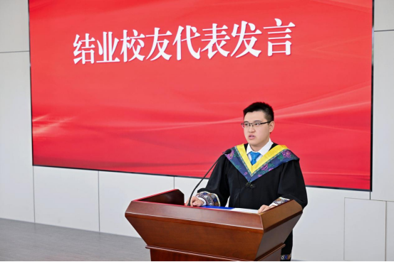结业校友代表2020级预科生罗士城同学发言。他回忆了在预科阶段的求学时光,感谢预科老师们的谆谆教导和无私奉献,让每位同学都在专业素养、实践能力和思想成长等方面取得了显著进步。他鼓励同学们,在本科阶段要珍惜时光,深耕专业知识、投身社会实践,以黄大年教授为榜样,将个人理想融入国家发展的滚滚洪流。