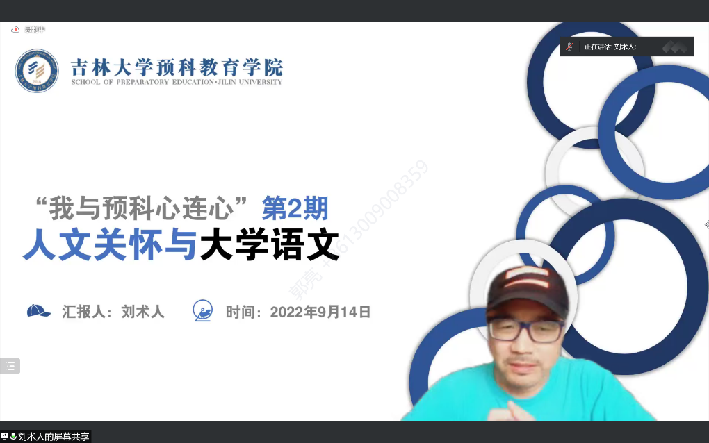 刘术人老师本次分享的主题是《人文关怀与大学语文》。他结合自己多年讲授预科大学语文课程的心得体会,概括性提出了大学语文教学中的“三乐”“三美”和“三高”的教学理念,介绍了适合预科学生特点的教学设计与课程思政,同时展示了学生作品和教学反馈。